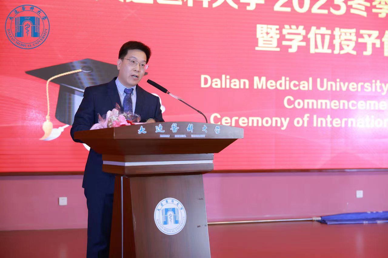 邵淑娟致辞,她代表学校对来自21个国家的67名国际学生顺利完成学业表示热烈祝贺并表达了殷切期望:“明仁、济世”,践行医者仁心的光荣使命;“甚解、敏行”,提升妙手丹心的精湛技艺;“开放、交流”,推动构建人类命运共同体。随后,卢苇宣读《2023届冬季国际学生学位授予决定》,校长赵杰分别为博士研究生、硕士研究生、本科毕业生拨穗并颁发毕业证书。