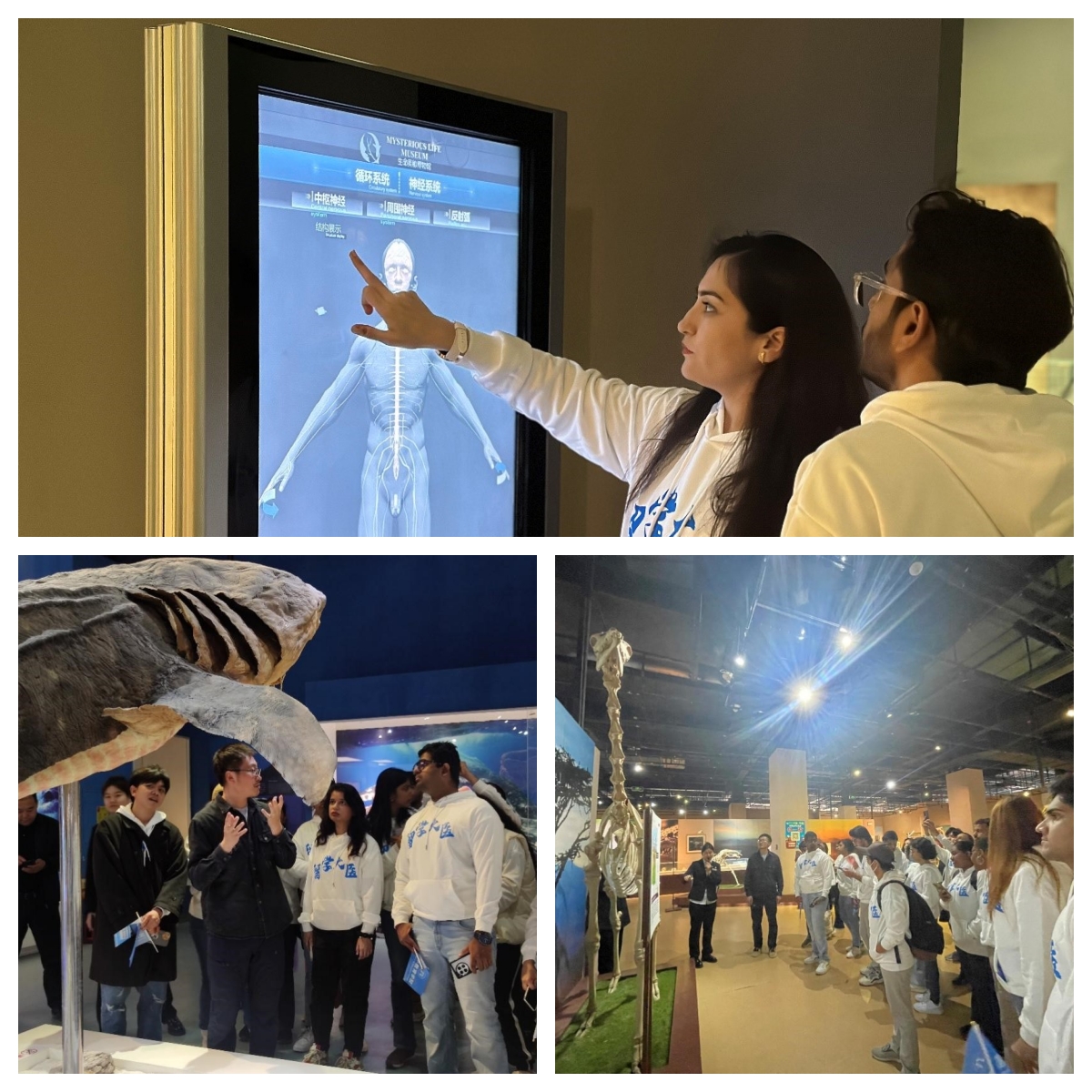 在博物馆里,学生们徜徉在海洋之魂、脊椎王国和人体世界三个展区,每个展区都如同一个生命的故事盒,讲述着生命的起源、演变和奇迹。同学们沉浸式感受不同生物带给他们的震撼,见证生命的创造力、生物的多样性以及人体的精密性。此外,博物馆里的生命互动展示屏使留学生们得以跨越时空的界限,亲身体验生命演化的奇妙历程,不仅让传统的博物馆参观变得趣味盎然,更让学生在心灵深处留下了深深的印记。