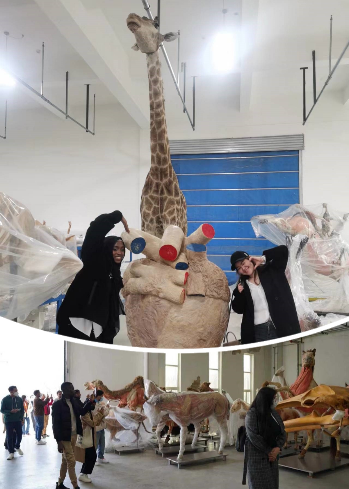 接下来,留学生们来到工厂仓库观看大型动物标本。这里有长颈鹿、犀牛、鲸鱼、海龟等上百种大型动物标本,其中有的保留了完整的皮毛外观,有的展示出了内脏器官,留学生们近距离地接触这些大型动物的内部构造,沉浸其中,并积极地向讲解人员和同行老师提问,气氛热烈。