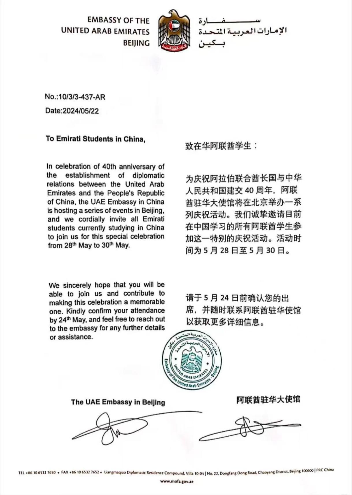 为庆祝中华人民共和国与阿拉伯联合酋长国建交40周年,阿联酋驻华大使馆在北京举办一系列庆祝活动。5月30日,我校首位来自阿联酋的临床医学专业留学生哈马德受邀赴北京参与庆祝活动,并与国内其他阿联酋留学生一起受到阿联酋总统谢赫·穆罕默德·本·扎耶德·阿勒纳哈扬的接见。