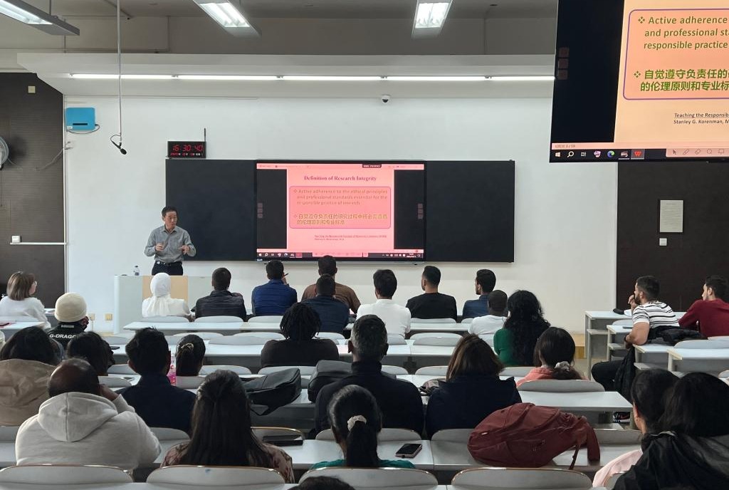 讲座中,雷海新教授以《科研中的道德伦理建设》为主题进行全程英文讲解。他从科研工作者的个人诚信、实验记录、数据处理的伦理原则、学术不端四个方面,深入浅出地讲解了科研中伦理审查的重要性。认真讲解了学术规范的基本要求,着重强调论文撰写格式规范的重要性;以论文撰写各环节的常见问题为例,探析如何提升创作投稿效能。讲座结束后,参会留学生就科研过程中的常见问题与雷海新教授进行了深入交流。