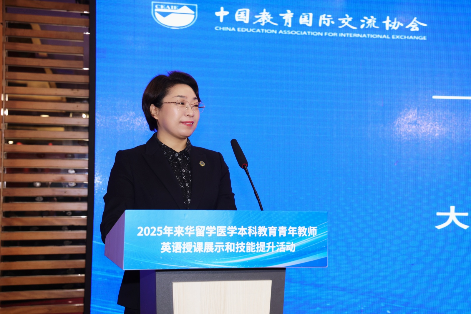 副校长杨晓丽出席开幕式并致辞。她向出席活动的专家学者表示欢迎,并简要介绍了我校来华留学医学教育工作。她指出,本次活动不仅为医学青年教师提供了展示与交流的平台,也为我国来华留学医学教育的质量提升与教学创新注入了强劲动力,希望各位青年教师在切磋技艺中实现超越、在交流互鉴中启迪智慧、在友谊的交流中收获成长。中国教育国际交流协会副秘书长安延,中国教育国际交流协会国际医学教育分会理事长、山东大学副校长易凡视频致辞,勉励青年教师在交流中取长补短、在实践中锤炼本领,努力提升跨文化教学能力,成长为兼具专业素养和国际视野的优秀医学教育者。