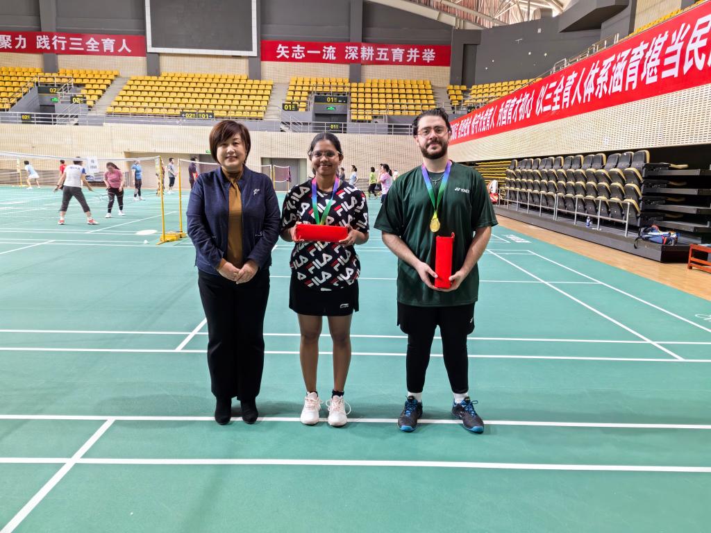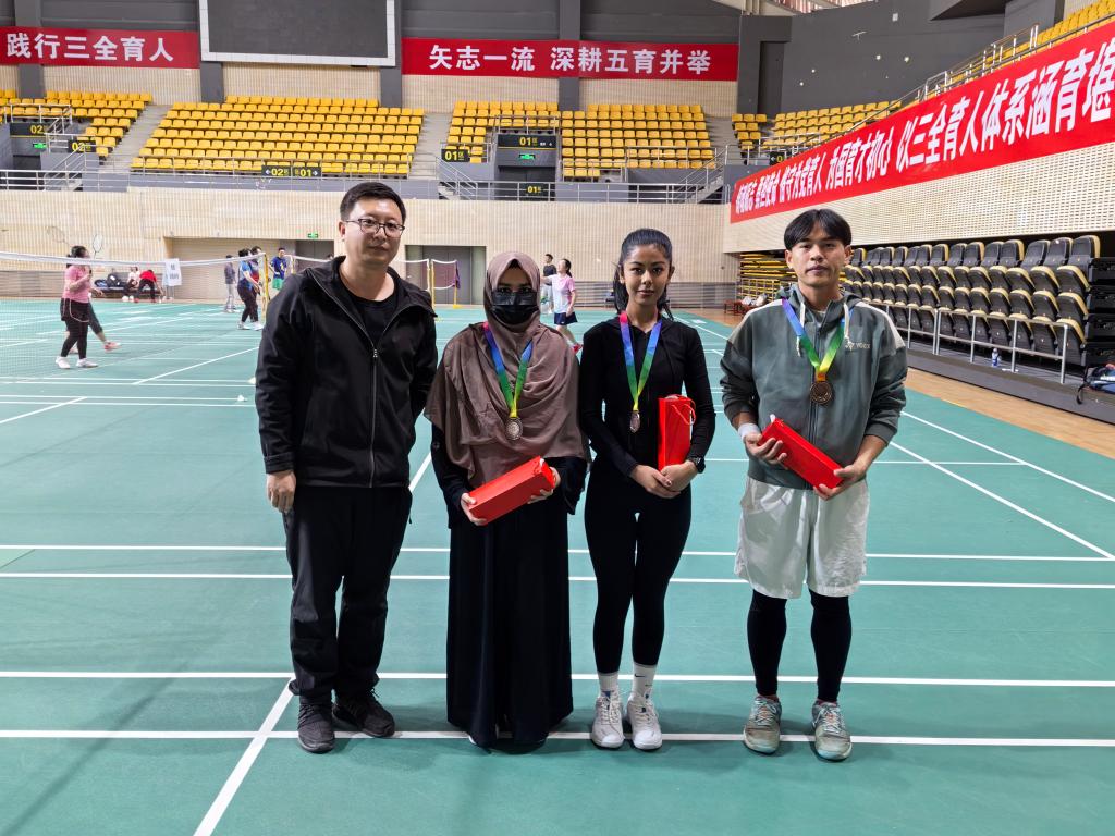 中午,比赛正式打响。男单首局便迎来高潮:伊朗籍学生阿米巴思与斯里兰卡籍学生迪岚多拍对拉,网前劈吊与后场跳杀交替上演,比分一路胶着;女单赛场同样精彩,印度尼西亚籍学生陈佳纹以灵活的步伐和精准的落点控制连连领先。经过三轮单淘汰赛,阿米巴思摘得男单冠军,女单冠军则被斯里兰卡籍学生罗威妮收入囊中。